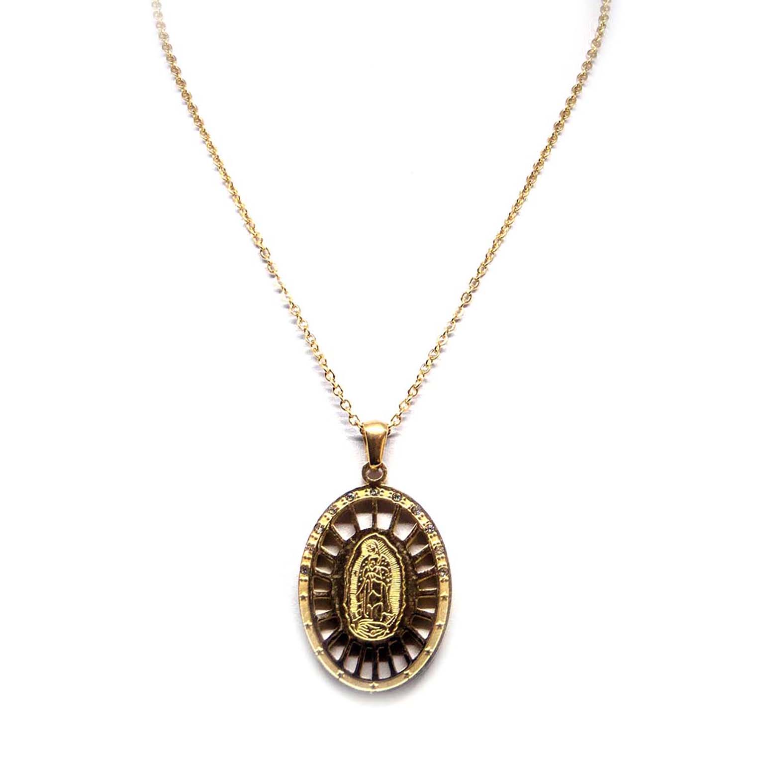 Guldpläterat stålhalsband med vacker berlock med gravyr föreställande Maria och barnet. Vita stenar.