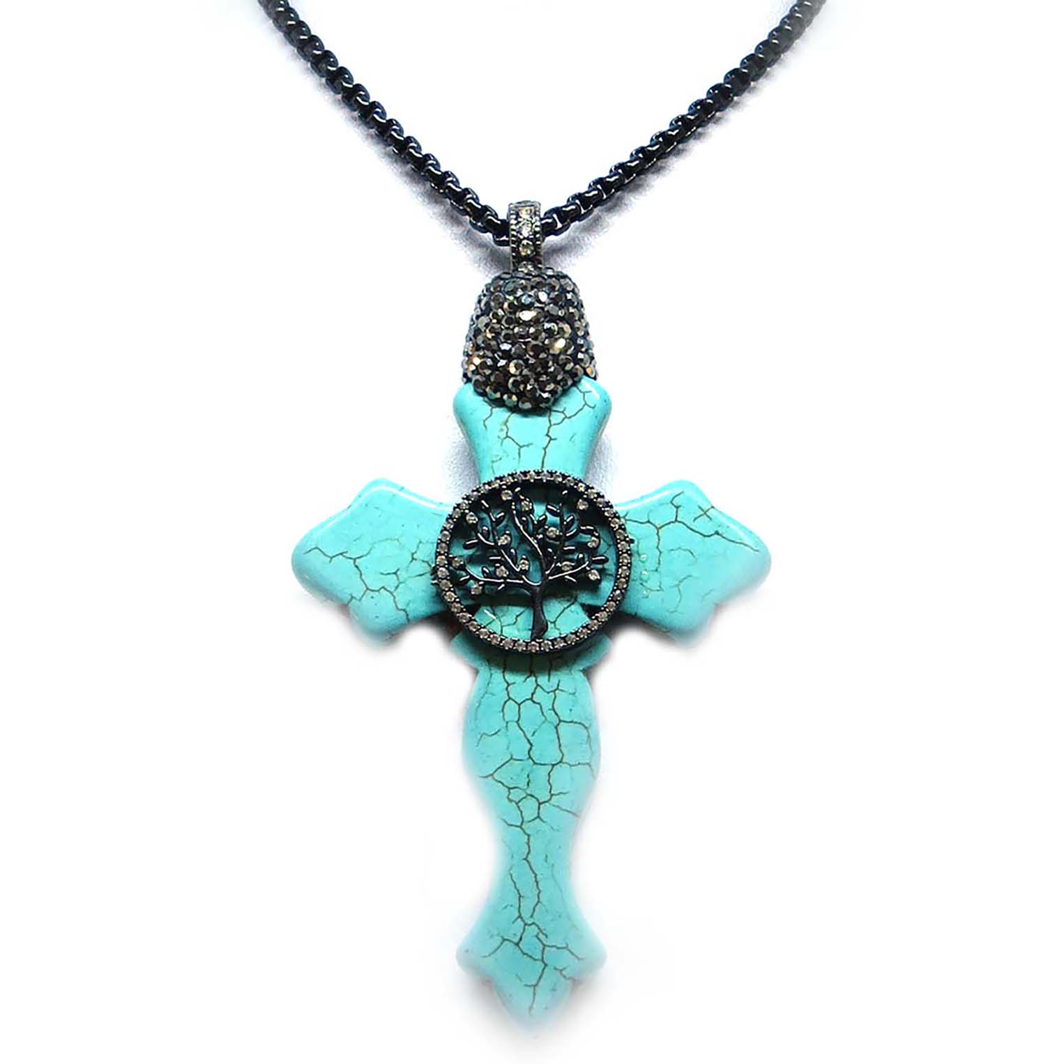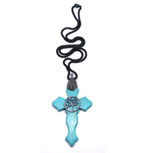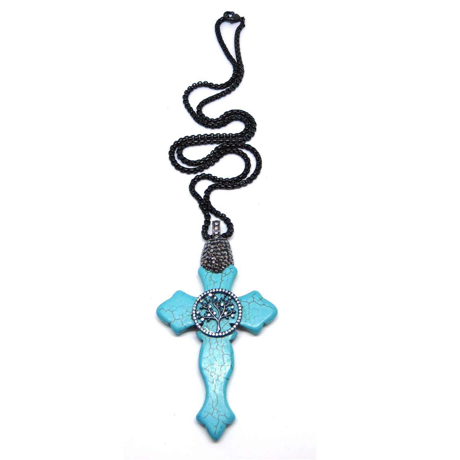Kraftigt halsband med kors i turkos med strassklädda detaljer.
