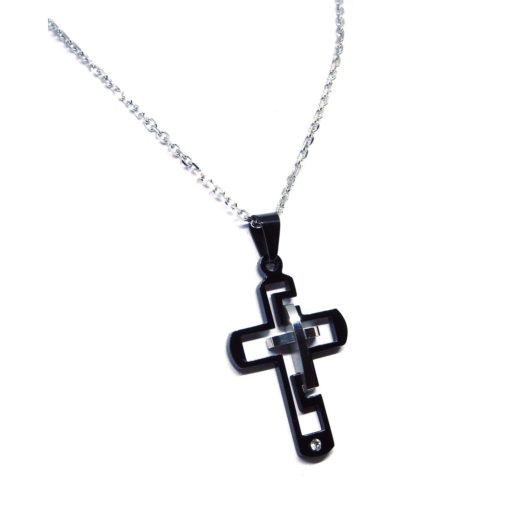 Fint stilrent kors i stål. Fina detaljer som svartpläterat stål och en vit glittrande sten.
