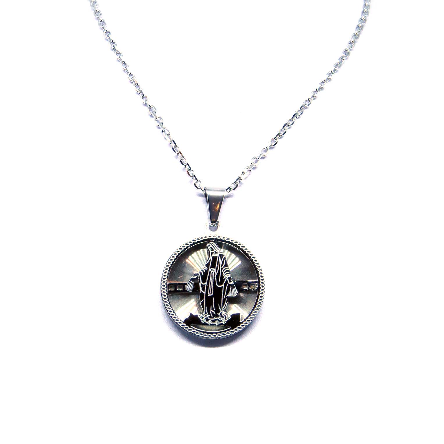 Halsband i stål med vacker berlock föreställande Jungfru Maria.